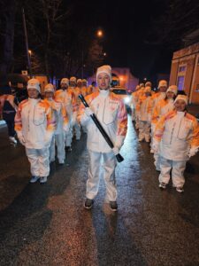 L’arrivo della Fiamma è stato annunciato dal rombo delle motociclette della Polizia Locale, seguito dalle auto con i lampeggianti e dai van degli sponsor, tra musica e voci che scandivano l’attesa. Poi, finalmente, Christian e Paolo, sotto la pioggia battente, fermi, concentrati, con la fiaccola stretta tra le mani come fosse un trofeo.