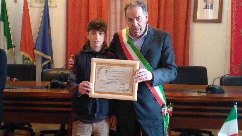 Nel corso di una breve ma significativa cerimonia nell’aula consiliare “Falcone-Borsellino”, il sindaco Enrico Di Giuseppantonio ha consegnato a nome dell’amministrazione comunale e della cittadinanza di Fossacesia, un attestato a Samuel Massa, 14 anni, studente dell’istituto nautico di Ortona, che una settimana fa, mentre era a pesca in compagnia di un amico sulla via Verde della Costa dei Trabocchi, si è tuffato in mare per salvare un capriolo che, ferito dopo essere stato investito da un’auto sulla statale Adriatica 16, annaspava dolorante in acqua.