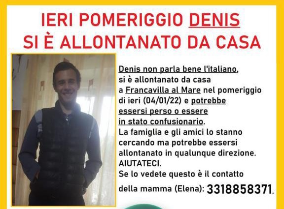 Dopo la scomparsa, un disperato appello era stato lanciato attraverso i social a Francavilla al Mare dai familiari di Denis. Su Facebook la notizia è stata diffusa sulla bacheca del gruppo “Francavilla al mare è tua”. La mamma Elena, i parenti e gli amici hanno lanciato l’appello mediatico per ritrovare Denis. Allertate anche le forze di polizia. Denis non parla bene l’Italiano e soffre di un ritardo cognitivo. “Si è allontanato da casa a Francavilla al Mare nel pomeriggio di ieri, 4 gennaio e potrebbe essersi perso o essere in stato confusionale. La famiglia e gli amici lo stanno cercando ma potrebbe essersi allontanato in qualsiasi direzione. Aiutateci”, si legge nel messaggio lanciato sui social. Poco fa il lieto fine e i familiari hanno potuto riabbracciare Denis.
