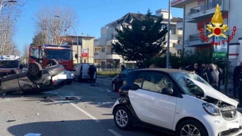 Spettacolare incidente stradale nel pomeriggio di ieri, domenica 13 marzo, a Francavilla al Mare. Nel violento impatto tra le due auto una si è ribaltata, due i feriti.