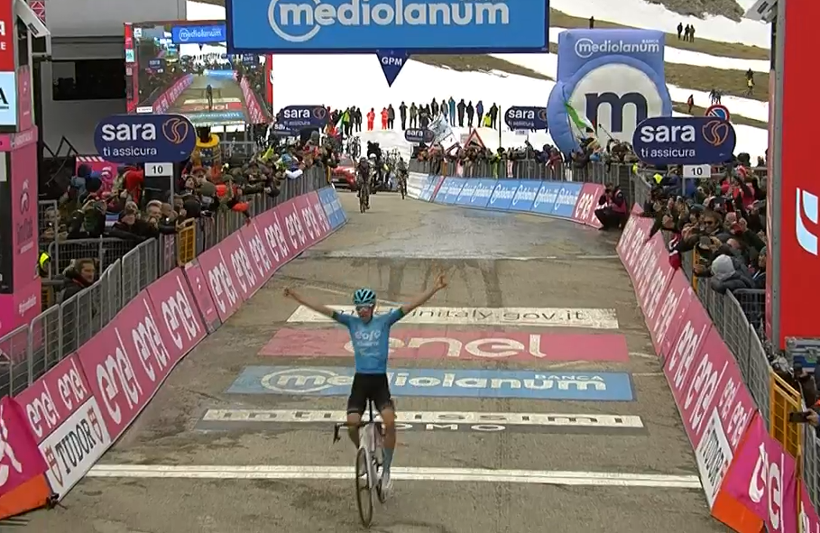Tagliato il traguardo della 7^ tappa del 106° Giro d’Italia: la carovana rosa raggiunge le altitudini del Gran Sasso a Campo Imperatore tra due muri di neve. Trionfa l’italiano Davide Bais