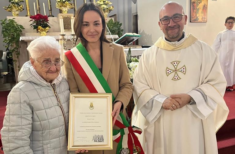 L’Amministrazione comunale, facendosi tramite di un affetto profondo e collettivo, ha voluto donarle una pergamena, segno della riconoscenza dell’intera città di Giulianova. Attorno a lei, l’affetto dei bambini, delle famiglie e del parroco don Enzo Manes.