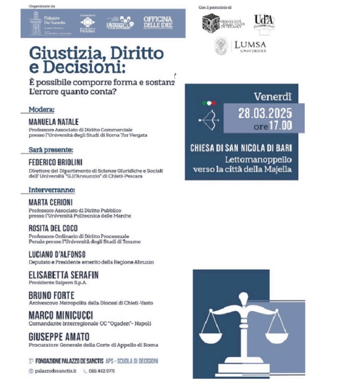 “Giustizia, diritto e decisioni: è possibile comporre forma e sostanza? L’errore quanto conta?” è il titolo dell’evento che si terrà venerdì 28 marzo alle ore 17 nell’edificio sacro San Nicola di Bari in piazza monsignor Giovanni Martorella a Lettomanoppello