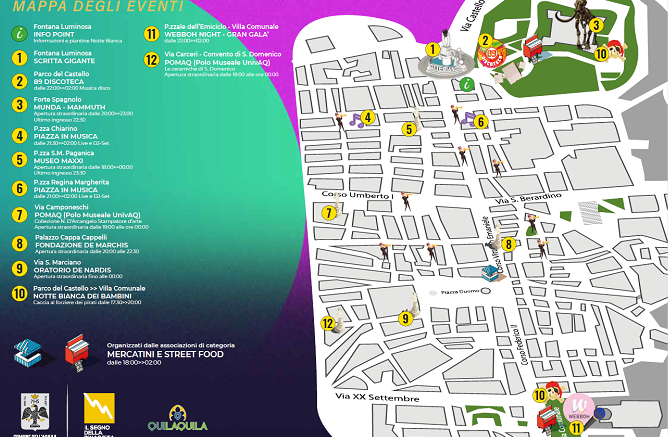 Le aperture. Il Munda consentirà le visite al Mammuth del Forte spagnolo (Castello cinquecentesco) dalle 20 alle 23, con ultimo ingresso alle 22.30. Il Maxxi a piazza Santa Maria Paganica osserverà un orario di apertura straordinaria dalle 18 a mezzanotte, con ultimo ingresso alle 23.30. Per quanto riguarda il Pomaq (Polo museale dell’università dell’Aquila), la sede di via Camponeschi sarà aperta dalle 19 fino a mezzanotte per visitare la Collezione D’Arcangelo Stampatore, e dalle 18 fino a mezzanotte sarà possibile visitare le ceramiche di San Domenico all’ex convento di via delle Carceri. La fondazione De Marchis aprirà il palazzo Cappa Cappelli, in corso Vittorio Emanueli, dalle 20 fino alle 22.30 e potrà essere visitato anche l’oratorio di Sant’Antonio de Nardis, in via San Marciano, fino a mezzanotte.