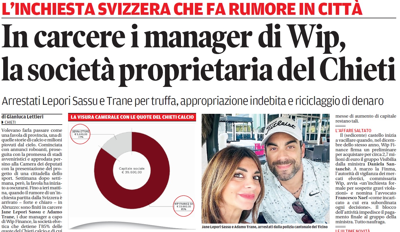 Jane Lepori Sassu 48enne svizzera e il suo partner, Adamo Trane 39enne italiano, i due manager a capo di Wip Finance, la società elvetica che detiene l’85% delle quote del club neroverde e di cui il patron teatino Altair D’Arcangelo (non coinvolto nell’indagine) si è autodefinito “procacciatore d’affari”, sono finiti in carcere nell’ambito di un’inchiesta partita dalla Svizzera. Secondo quanto riportato stamani sulle colonne del quotidiano “il Centro”, le accuse ipotizzate sono truffa, appropriazione indebita, amministrazione infedele e riciclaggio di denaro. La notizia, confermata dalle stesse autorità elvetiche, proietta il Chieti Calcio in una dimensione di totale incertezza. Intanto il Presidente della società neroverde, Gianni Di Labio, contattato stamani telefonicamente ha affermato che: