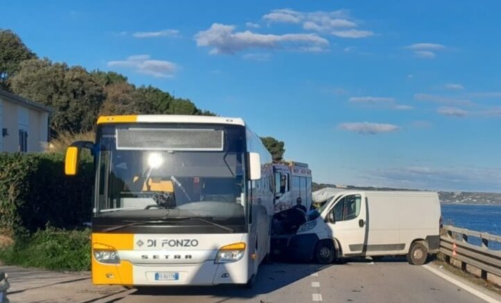È di un ferito il bilancio a seguito di un tamponamento di un furgone Ducato contro la parte posteriore laterale di un bus della Di Fonzo Spa per il traporto studenti. L’incidente è avvenuto alle 7.30 sulla statale 16 in località Le Morge di Torino di Sangro. Il traffico è rimasto bloccato in entrambe le direzioni e sul posto sono giunti anche addetti dell’Anas. Secondo una prima ricostruzione della dinamica, il conducente del furgone, un 74enne residente a Vasto, sarebbe rimasto abbagliato dal sole e non si è accorto in tempo che il bus di linea, con le frecce inserite, era fermo per far salire passeggeri.