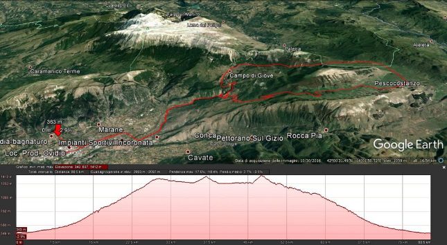 - Percorso: Attraversamento della città di Sulmona , si prosegue per Cansano e di qui si va verso il bosco di Sant’Antonio. Si raggiunge quindi il Comune di Pescocostanzo e successivamente attraversando l’altopiano del Quarto di Santa Chiara, fino ad arrivare al valico della Forchetta-Palena.