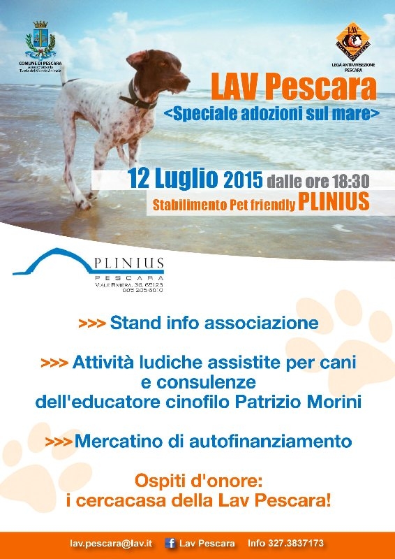 La Lav scende in spiaggia a Pescara per incontrare i cittadini e sensibilizzarli sul tema dei diritti degli animali. Il consueto appuntamento estivo con la Lav (Lega anti vivisezione) è per domenica 12 luglio dalle ore 18,30 presso lo stabilimento balneare Pets friendly Plinius in viale Riviera 36 a Pescara.