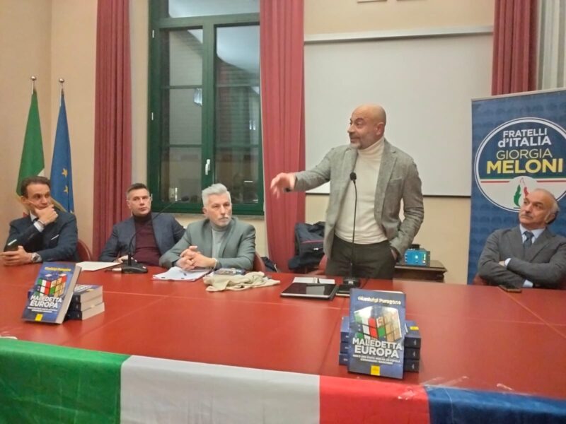 Il volume affronta in chiave critica il rapporto tra Italia e istituzioni europee, analizzando effetti, limiti e contraddizioni dell’attuale assetto comunitario. Oltre a Paragone, ex senatore del M5S e antieuropeista convinto (tra i fondatori del partito politico Italexit) sono intervenuti l’on. Guerino Testa, vicecoordinatore regionale di Fratelli d’Italia, insieme ai coordinatori provinciale e cittadino, Stefano Cardelli e Andrea Cocchini. A moderare il dibattito, Gianluca Buccella, responsabile del dipartimento provinciale Iniziative Editoriali.