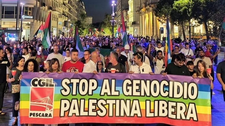 Oltre cinquemila persone sono scese in piazza in Abruzzo, per una mobilitazione promossa dalla CGIL regionale contro i bombardamenti su Gaza. I cortei si sono svolti in contemporanea a Pescara, L’Aquila, Vasto e Teramo, uniti dal grido di pace e solidarietà