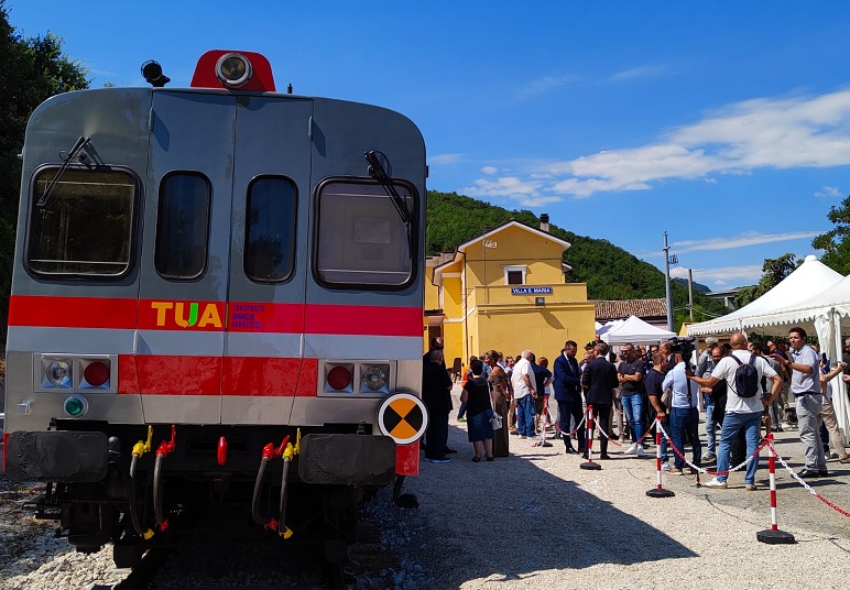 La storica stazione ferroviaria di Villa Santa Maria accoglie un convoglio ALn 776 bicabina della Società di trasporto pubblico TUA, partito dalla stazione di Archi, con tanto di applausi dei presenti a sottolineare l’eccezionalità dell’evento. Si è svolta stamani, infatti, la corsa prova finalizzata a testare la fattibilità di riapertura della linea. Ad eseguirla è stato un convoglio ALn 776 bicabina della Tua, l’azienda unica del trasporto abruzzese. Partito da Archi, il treno è arrivato alla stazione di Villa Santa Maria. A bordo c’erano, tra gli altri, il presidente della Regione Abruzzo, Marco Marsilio, è quello della Tua, Gianfranco Giuliante.