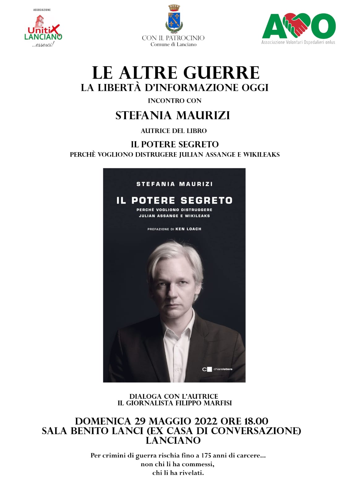 Evento patrocinato dal Comune e sponsorizzato dall’Avo e dall’Associazione UnitiXLanciano. Partecipa la giornalista d’inchiesta Stefania Maurizi, chiamata a presentare il suo ultimo saggio “Il potere segreto. Perché vogliono distruggere Julian Assange e WikiLeaks”. Seguirà un dibattito sulla libertà di stampa e d’informazione. Dialoga con l’autrice il giornalista Filippo Marfisi.