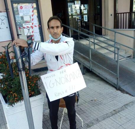 “Chiuso per ignoranza. Basta”: questo il cartello che Vicenzo Di Rado, 49 anni, di Lanciano, si è appeso al petto. Una palestra che gestisce con la moglie istruttrice a Castel Frentano. Di Rado in oltre 25 anni di attività ha anche svolto atletica e allenato diverse società di calcio. La sua provocazione è stata accolta da tutti gli altri proprietari di palestre e centri sportivi di Lanciano e comuni limitrofi che si ritroveranno a manifestare giovedì mattina, alle 11, in piazza Plebiscito a Lanciano. Anche molti clienti appoggeranno la protesta.