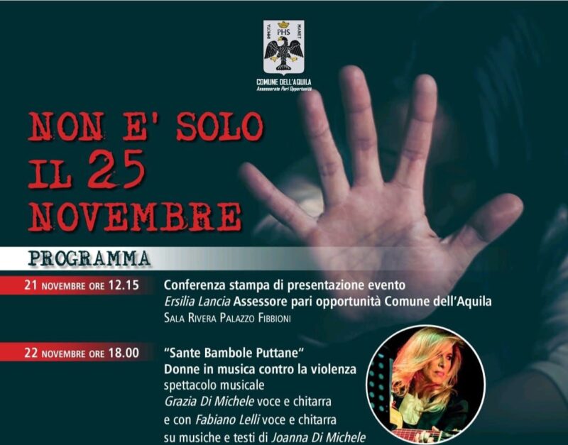 Il tutto in un’ottica: quella che non è solo una giornata simbolica per ribadire un concetto, ma la lotta deve essere quotidiana. Non è casuale infatti che non ci siano spettacoli anche se qualcosa si farà proprio il 25 novembre. L’assessore Ersilia Lancia ha presentato il programma che parte domani con uno spettacolo musicale al ridotto del teatro alle 18 con Grazia De Michele e Fabiano Lelli “Sante bambole puttane”.