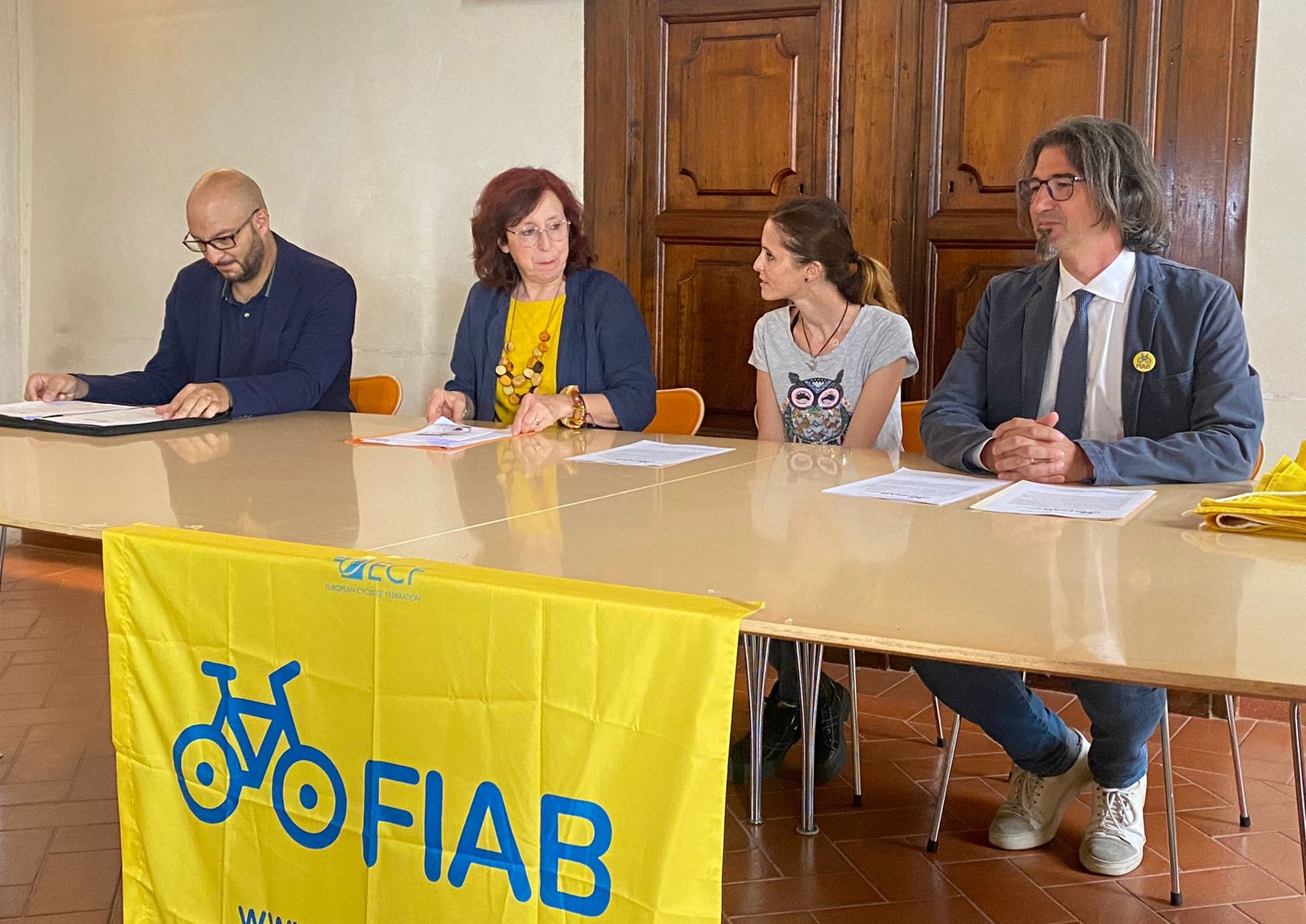 L’Aquila Comune ciclabile 2023 con tanto di bandiera di attestazione che è stata consegnata dalla sezione locale della Fiab, Federazione italiana ambiente e bicicletta, al sindaco Pierluigi Biondi e all’assessore alla mobilità Paola Giuliani