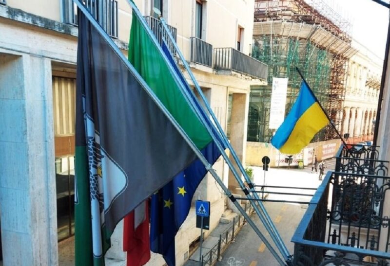 La Fontana Luminosa dell’Aquila illuminata di giallo e blu, i colori della bandiera dell’Ucraina che da questa mattina è esposta sulla facciata di Palazzo Fibbioni, sede centrale del Comune capoluogo abruzzese. La Municipalità ha inteso, in questo modo, dare un segnale di vicinanza alla popolazione dello stato dell’est europeo, duramente provata dalla guerra in corso.