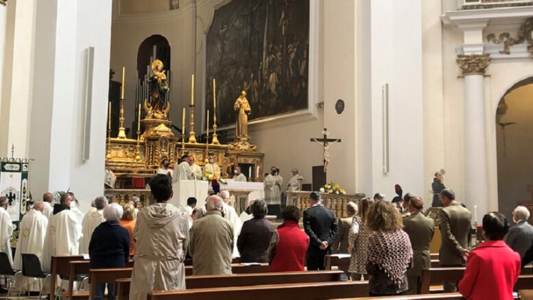 La Basilica di San Bernardino oggi è vestita a festa per la celebrazione del compatrono della città con la santa messa del cardinale Petrocchi e con l’offerta dell’olio della lampada votiva affidata alla nobile contrada dell’Aquila di Siena