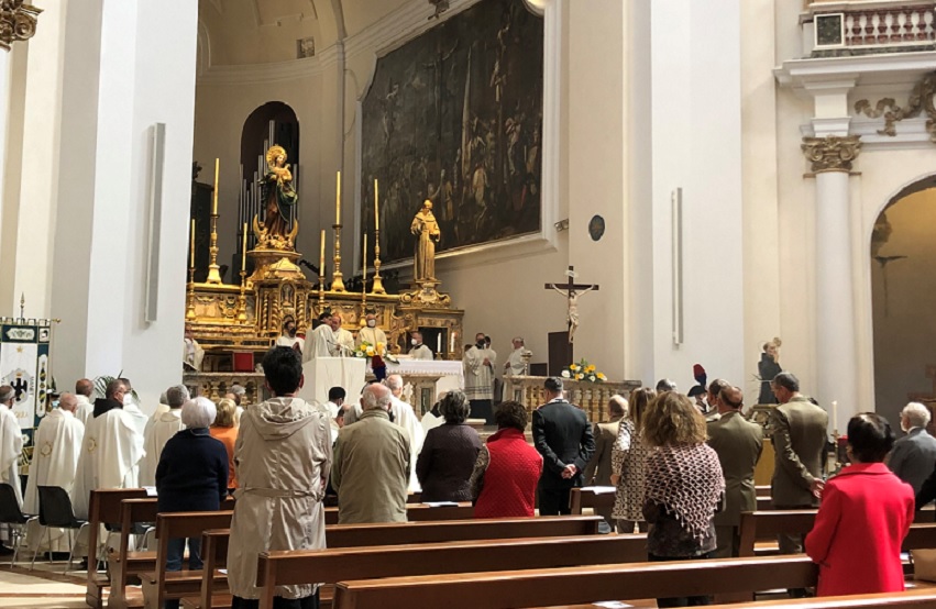 La Basilica di San Bernardino oggi è vestita a festa per la celebrazione del compatrono della città con la santa messa del cardinale Petrocchi e con l’offerta dell’olio della lampada votiva affidata alla nobile contrada dell’Aquila di Siena