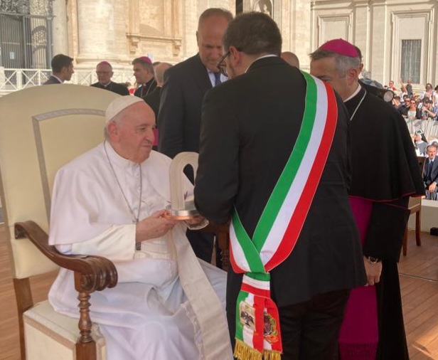 Non poteva che essere consegnato a lui, al Pontefice, il protagonista della Perdonanza numero 728. Questa mattina a Roma la consegna ufficiale di questo riconoscimento dedicato alla difesa dei più deboli e all’affermazione della pace, premio che trae ispirazione dal lascito morale di Celestino V. Il Papa nel salutare tutti i presenti ha nominato L’Aquila e la sua delegazione prima dell’incontro. Il Santo Padre ha accolto in udienza generale la delegazione presieduta dal sindaco Biondi, dal vescovo ausiliare monsignor Antonio D’Angelo, da alcuni rappresentanti del comitato Perdonanza e dallo scultore orafo che ha realizzato l’opera Paolo Mazzeschi. C’era anche il presidente della Regione Abruzzo Marco Marsilio. Un momento di grande emozione dopo la splendida giornata vissuta col Papa a L’Aquila da lui nominata capitale del Perdono.