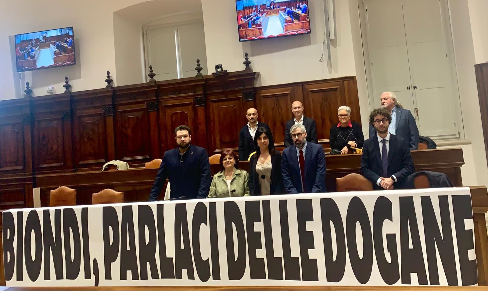 La maggioranza ha abbandonato l’aula, l’opposizione ha accusato il sindaco di sottrarsi al confronto. All’ingresso del sindaco Pierluigi Biondi, i consiglieri di opposizione hanno srotolato in aula un drappo con la scritta “Biondi, parlaci delle Dogane” per chiedere chiarezza sul futuro