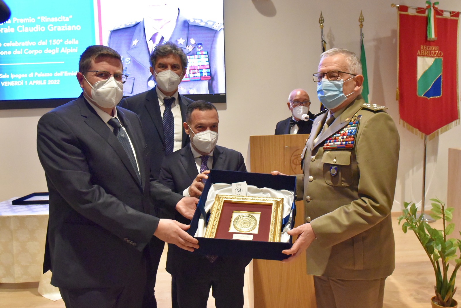 Graziano è stato in prima linea in Abruzzo in occasione del terremoto dell’Aquila del 2009. Un omaggio alle “penne nere” nella ricorrenza del 150/o anno dalla nascita del Corpo. È stato lo stesso Sospiri a spiegare le motivazioni del riconoscimento: “Al Generale Graziano il Consiglio Regionale dell’Abruzzo conferisce oggi il Premio della ‘Rinascita’, un rosone cinto dalle foglie di acanto due simboli molti forti, il rosone che rappresenta nella nostra tradizione cristiana il dominio di Cristo sulla terra e le foglie di acanto che nel cristianesimo primitivo e poi in quello medievale rappresentavano il simbolo della resurrezione. Che essi siano un segno della fiducia, della gratitudine, della vicinanza e del costante sostegno del popolo d’Abruzzo nei confronti del suo operato e il ringraziamento unanime rivolto al Corpo degli Alpini”.