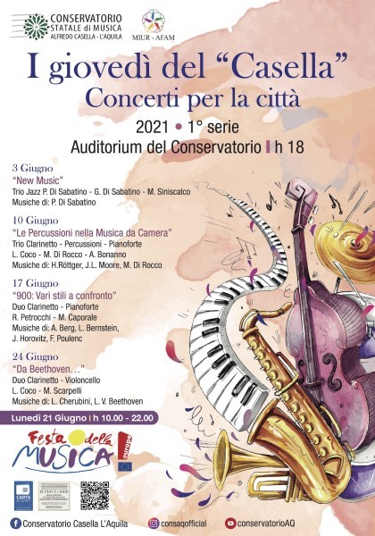 Il 21 giungo torna dal vivo e in presenza la “Festa della Musica”, annuale evento musicale per celebrare il solstizio d’estate in più di 120 nazioni in tutto il mondo: all’Aquila coinvolgerà tutti i corsi del conservatorio con appuntamenti di vario genere che si svolgeranno per tutto il giorno dalle ore 10.00 alle 22.00. La giornata sarà aperta dalla cerimonia di premiazione degli studenti vincitori della prima edizione del “Premio Conservatorio Casella”, realizzato grazie al sostegno della Fondazione Carispaq.
