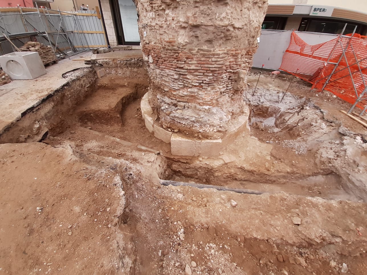“Gli archeologi – dichiara il Prof. Fabio Redi coordinatore scientifico degli scavi – hanno rinvenuto, a circa 1,70 m dal piano stradale, lo spiccato del monumento in perfetto apparato murario in pietra, a grossi conci di calcare massiccio, con piata regolarissima ellittica, dalla quale aggetta verso la città un semi pilastro a sezione rettangolare. Le fondazioni della struttura appaiono molto solide, estese in orizzontale e in profondità, realizzate anche in funzione del peso notevole del manufatto. Questo ritrovamento ci fa escludere fin da adesso che si tratti di una struttura a carattere funerario di età imperiale, in quanto è realizzata con materiali di spoglio; tuttavia è ancora troppo presto per affermare che appartenga all’acquedotto trecentesco di Santanza piuttosto che a opera idraulica di epoca successiva, costruita per la compensazione piezometrica della pressione dell’acqua che aveva creato problemi di flusso in città”. Il rinvenimento, che contribuisce ad arricchire la storia passata della nostra città, sarà opportunamente restaurato e lasciato a vista fin dalla base interrata.
