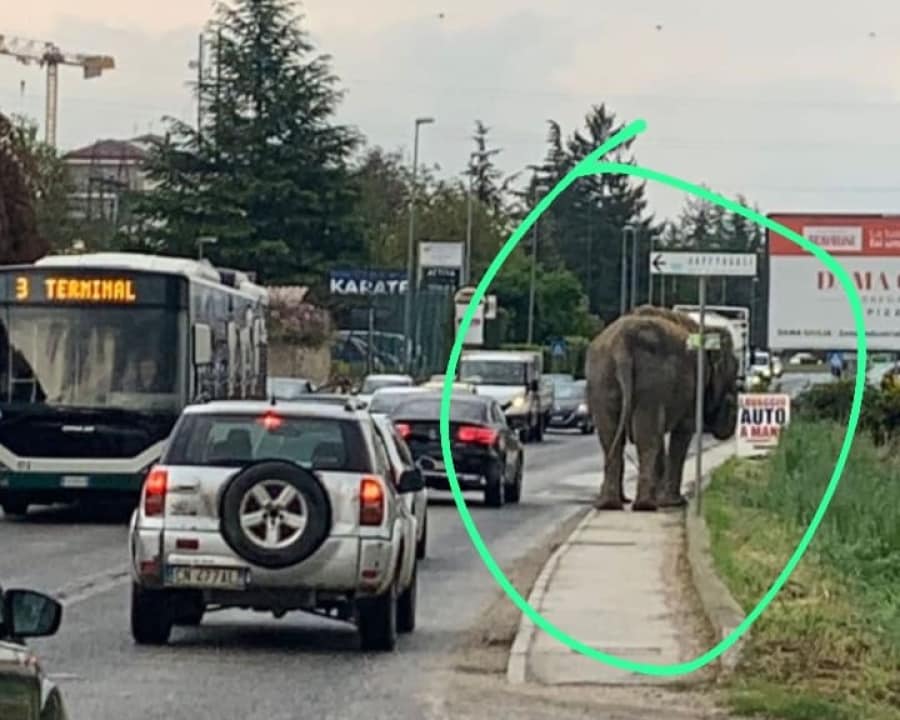Un elefante a passeggio lungo una strada mediamente trafficata dell’Aquila. In città, tra lo stupore generale, si accendono le polemiche