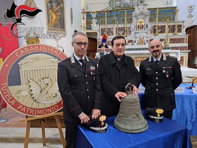Scomparsa negli anni ’50 dalla chiesa di San Michele Arcangelo a Ripabottoni durante lavori di demolizione e ricostruzione, è stata ritrovata in un’abitazione privata in un paese vicino Campobasso ed oggi restituita alla comunità di origine grazie a complesse indagini del Nucleo Carabinieri per la Tutela Patrimonio Culturale di L’Aquila: ‘protagonista’ della vicenda, una campana in bronzo risalente al 1864