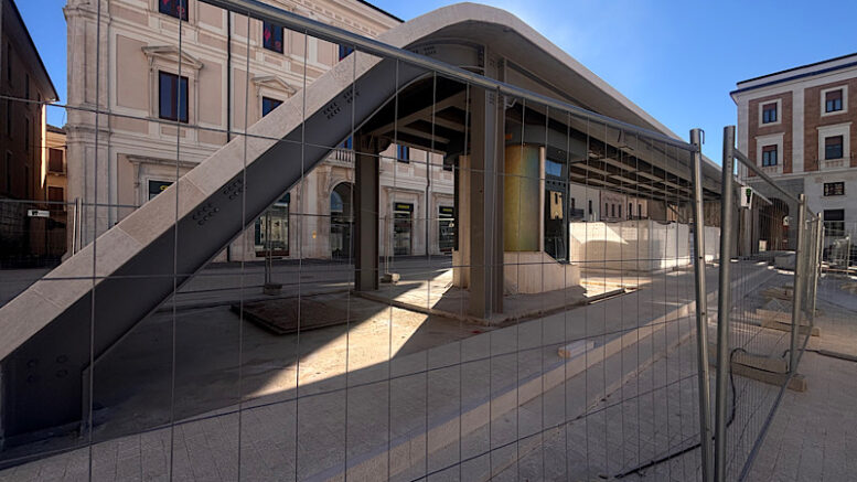 Tra la revoca del contratto da parte dell’amministrazione alla vecchia ditta e il conseguente ricorso, sono ancora fermi i lavori della piazza e dunque anche della pensilina sulla quale in città si sono scatenati vivaci dibattiti perché, in effetti, impatta per molti davvero troppo. La pensilina, in pratica, é l’uscita sulla piazza del tapis roulant che dal terminal di Collemaggio conduce al centro storico.