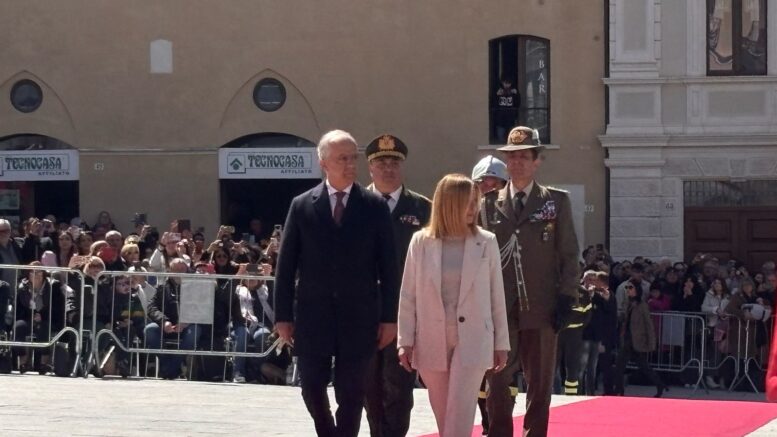 Giorgia Meloni ha raggiunto il capoluogo della regione in elicottero, accompagnata da Marco Marsilio. Dopo la cerimonia ha lasciato L’Aquila e nel pomeriggio Meloni rientrerà a Roma per presiedere, alle 18, il Consiglio dei Ministri.