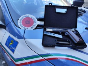 Sotto il sedile lato guida, a seguito delle dichiarazioni spontanee del fermato, veniva rinvenuta una pistola scacciacani Marca Automatic Bruni cal 9K con tappo rosso, completa di caricatore ed 8 cartucce a salve, sottoposta a sequestro.