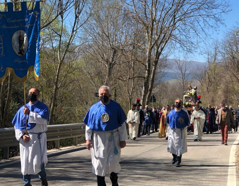 La processione, seppur in forma ridotta, è partita alle 10.30 dalla chiesa del cimitero per arrivare al santuario della Madonna d’Appari che si trova tra Paganica e Camarda dove è stata celebrata la messa. In processione soltanto la statua della Madonna per ragioni legate al Covid. Paganica si è ritrovata in festa dopo due anni durissimi con le tradizioni locali che includono anche la tradizionale fiera di pasquetta che hanno riportato in paese moltissima gente. Per il parroco di Paganica Don Dionisio Rodriguez è un momento importante dal punto di vista religioso ma anche perché finalmente si torna comunità.