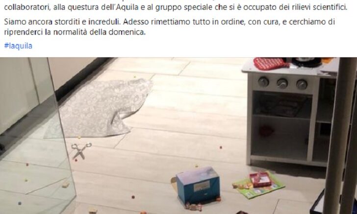 “La nostra intimità familiare, violata. Grazie di vero cuore al comando provinciale dei carabinieri, al colonnello Mirante e a tutti i suoi collaboratori, alla questura dell’Aquila e al gruppo speciale che si è occupato dei rilievi scientifici. Siamo ancora storditi e increduli. Adesso rimettiamo tutto in ordine, con cura, e cerchiamo di riprenderci la normalità della domenica”.