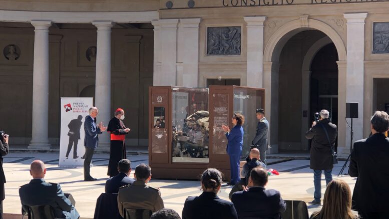 E’ la teca con i resti della Fiat Croma sulla quale viaggiavano gli agenti di scorta del giudice Falcone, colpita dalla deflagrazione di circa 500 chili di tritolo a Capaci, nell’attentato in cui morirono i giudici Giovanni Falcone e Francesca Morvillo, gli agenti di scorta Vito Schifani, Antonio Montinaro e Rocco Dicillo che viaggiavano sulla Quarto Savona Quindici. Un viaggio della memoria che in Abruzzo ha avuto diverse tappe, concluse all’Aquila.