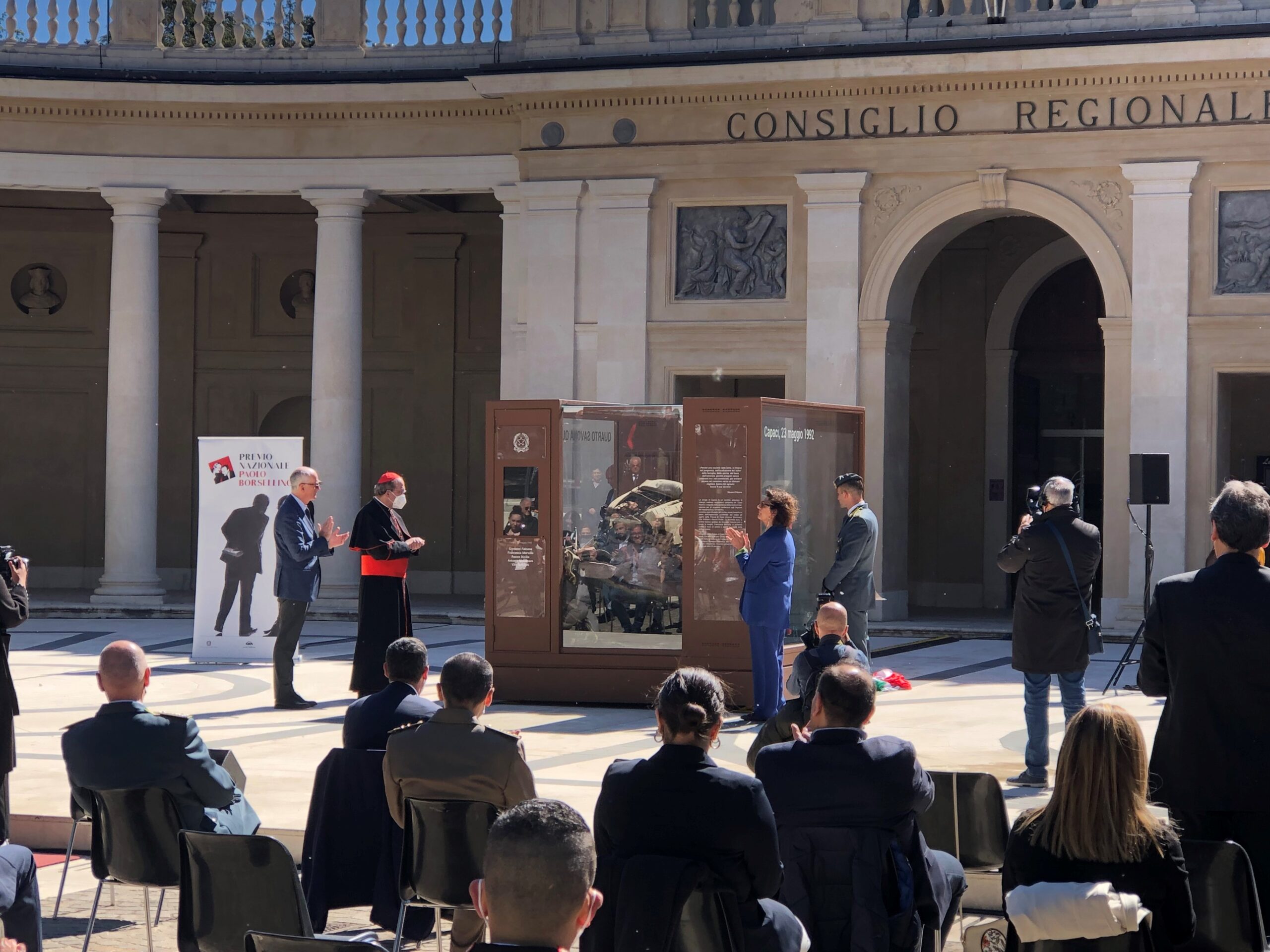 Oltre al disvelamento della teca l’Emiciclo ha ospitato anche un momento di approfondimento che ha visto, tra gli altri, la presenza del procuratore Michele Renzo, del magistrato Roberta D’Avolio, di Franco Gabrielli, Emanuele Schifani, figlio dell’agente Vito e la vedova di Antonio Montinaro, Tina.