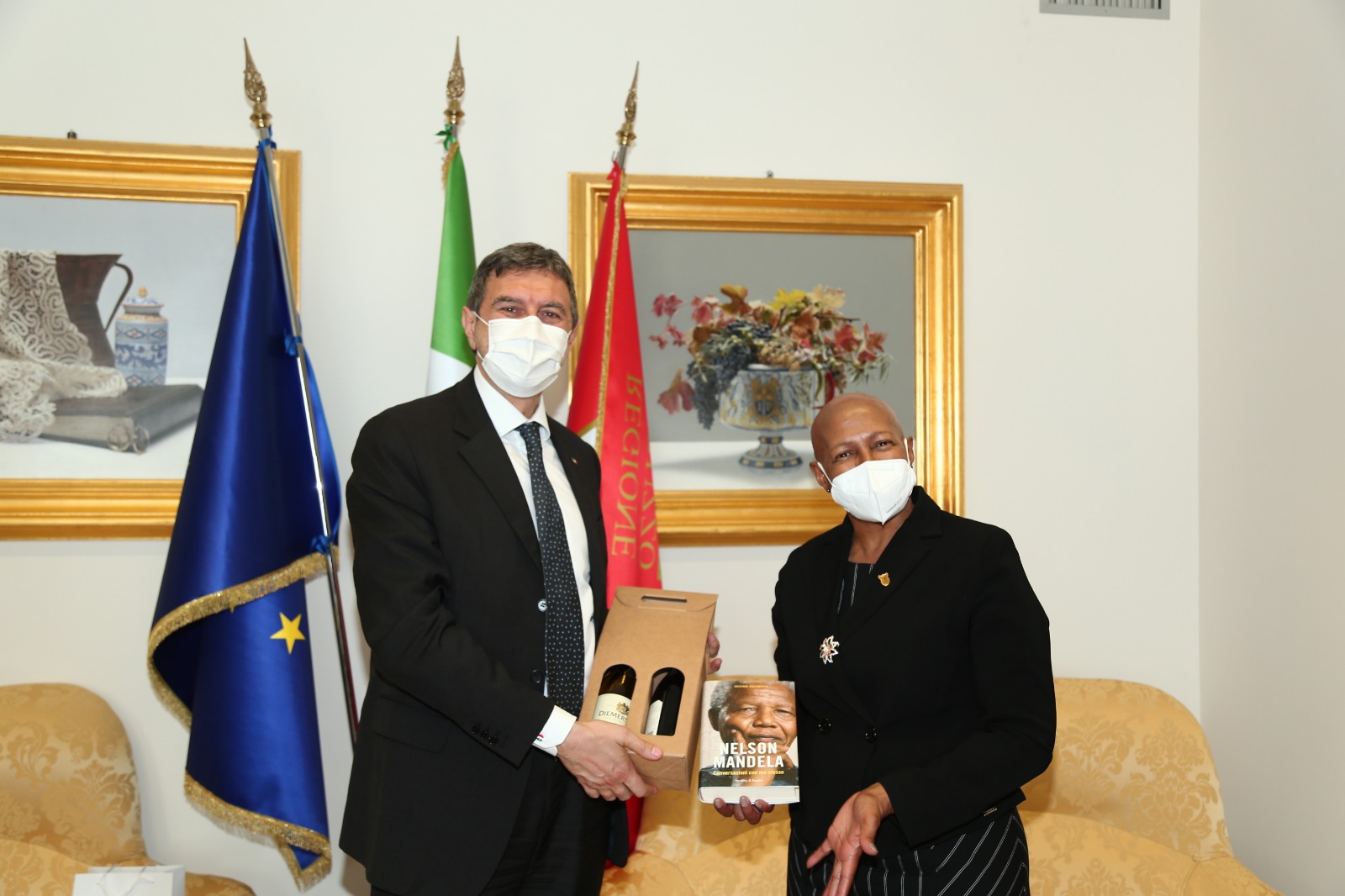 L’ambasciatrice ha fatto dono al presidente Marsilio di un libro che racconta delle vicissitudini di Mandela e dei grandi mutamenti democratici che hanno fatto seguito alla sua nomina a presidente della Repubblica.