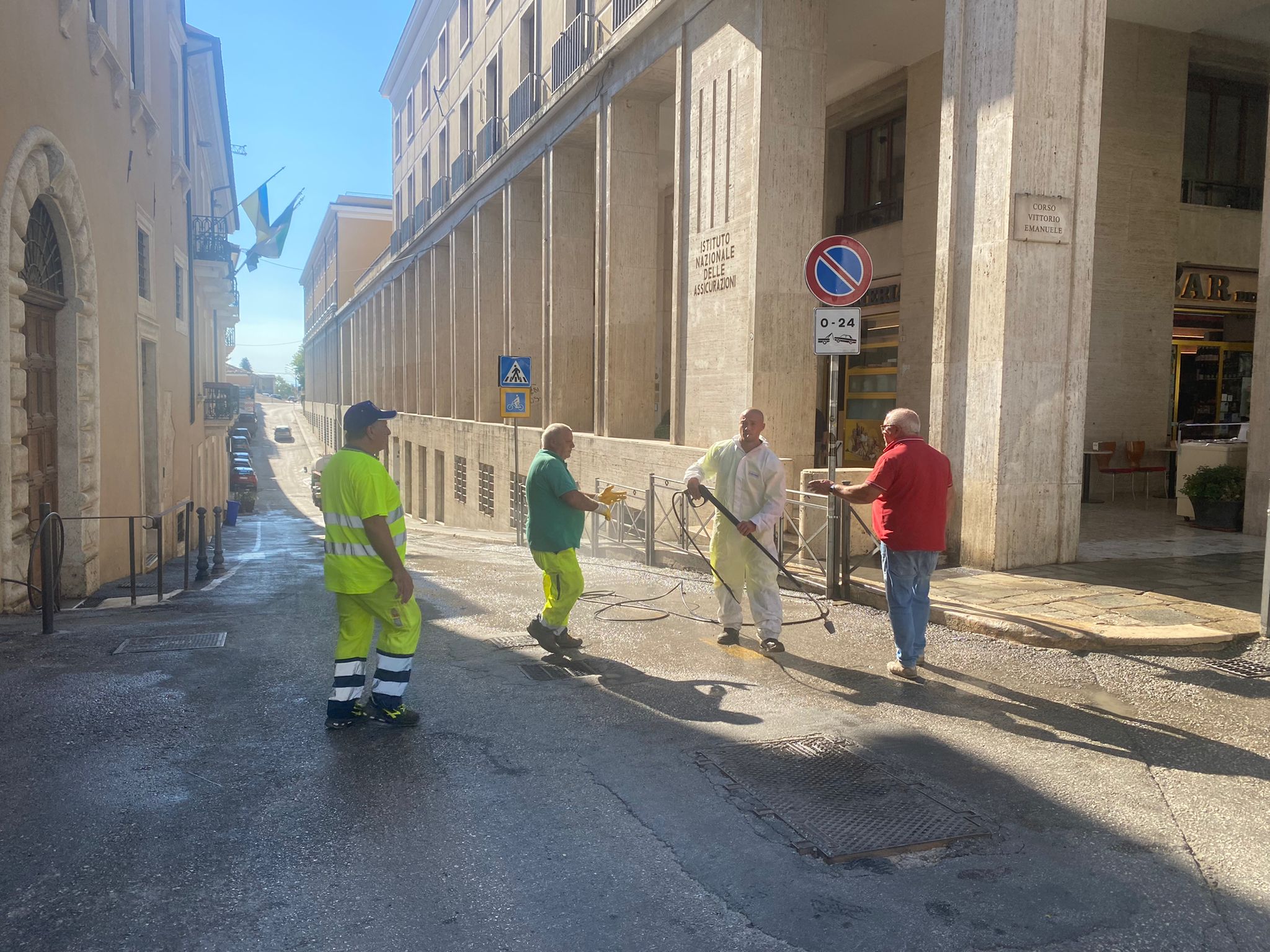 Tutti a lavoro, gli operai dell’Asm la municipalizzata comunale, per ripulire i portici di San Bernardino la cui pavimentazione imbrattata era stata oggetto di numerose segnalazioni