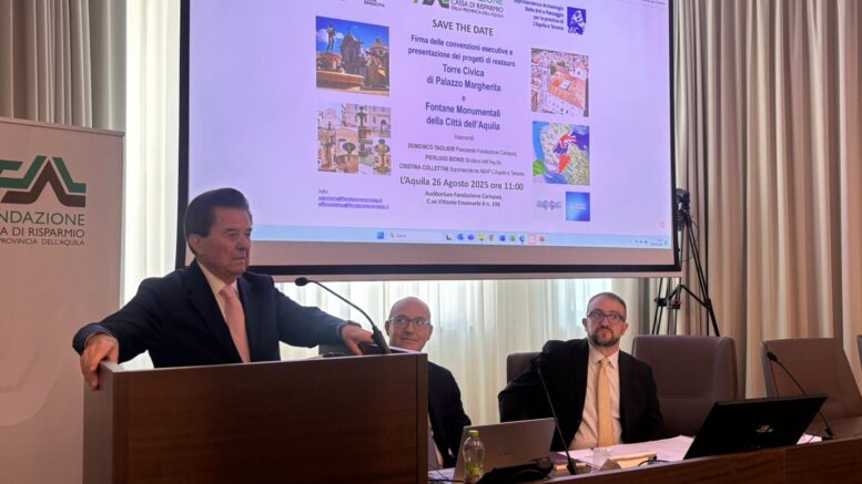 Questa mattina, presso la sede della Fondazione Carispaq, sono state sottoscritte infatti le convenzioni esecutive per il restauro della Torre Civica di Palazzo Margherita e delle Fontane Monumentali dell’Aquila. Nell’occasione sono stati presentati alla stampa i relativi progetti esecutivi.