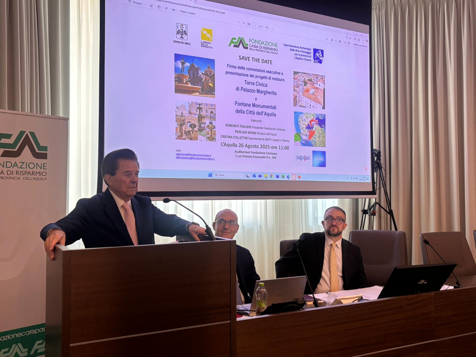 Questa mattina, presso la sede della Fondazione Carispaq, sono state sottoscritte infatti le convenzioni esecutive per il restauro della Torre Civica di Palazzo Margherita e delle Fontane Monumentali dell’Aquila. Nell’occasione sono stati presentati alla stampa i relativi progetti esecutivi.