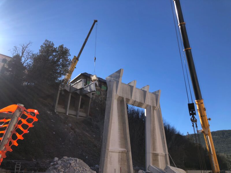 L’infrastruttura demolita sarà sostituita da un ponte strallato, cioè un ponte sospeso il cui impalcato sarà retto da una serie di cavi ancorati a piloni di sostegno. I lavori sono portati avanti dall’associazione temporanea di imprese Edimo – Todima per un importo complessivo di 5,2 milioni di cui circa 200 destinati alla demolizione. L’ingresso su via Fontesecco che era stato interdetto all’inizio ora è regolarmente aperto. La costruzione del nuovo ponte, il cui progetto prevede la realizzazione di due corsie carrabili, un percorso pedonale e una pista ciclabile, dovrebbe terminare nel 2022.