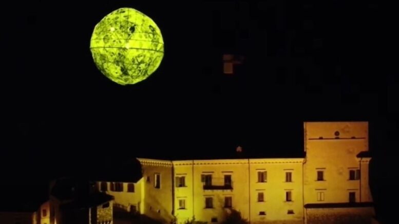 Tutti con naso all’insù a Fontecchio per ammirare la performance dell’artista Sebastian Alvarez che ha illimitato il paese con la luna sospesa ad una gru.