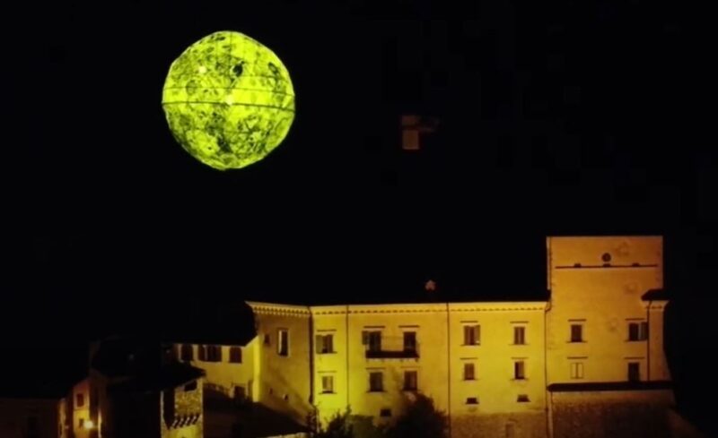Come nelle Cosmicomiche di Italo Calvino, la luna mai è stata così vicina, quasi a toccarla, sui tetti di Fontecchio, paese medioevale nella media Valle dell’Aterno, in provincia dell’Aquila. Per di più appesa ad una gru dei cantieri della ricostruzione post sisma 2009. A realizzarla l’artista peruviano Sebastian Alvarez, uno dei protagonisti di Riabitare con l’arte, progetto di Carsa con il sostegno dell’Usrc che fino ad ottobre avrà come teatro diversi comuni del territorio.