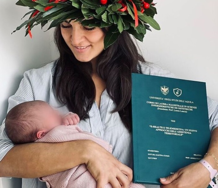 Dottoressa e mamma nello stesso giorno per non saltare una sessione che avrebbe recuperato solo nella primavera del 2023. Protagonista della vicenda è Martina Cuomo, studentessa di Napoli, che si è laureata e, proprio, nello stesso giorno ha dato alla luce la sua dolcissima bambina. Gli auguri alla ragazza arrivano anche dall’Università dell’Aquila che, sui propri canali, ha pubblicato un messaggio di augurio, con tanto di foto con in testa la corona d’alloro. In una mano la tesi di laurea in Scienze infermieristiche e ostetriche, nell’altra la piccola Nunzia.