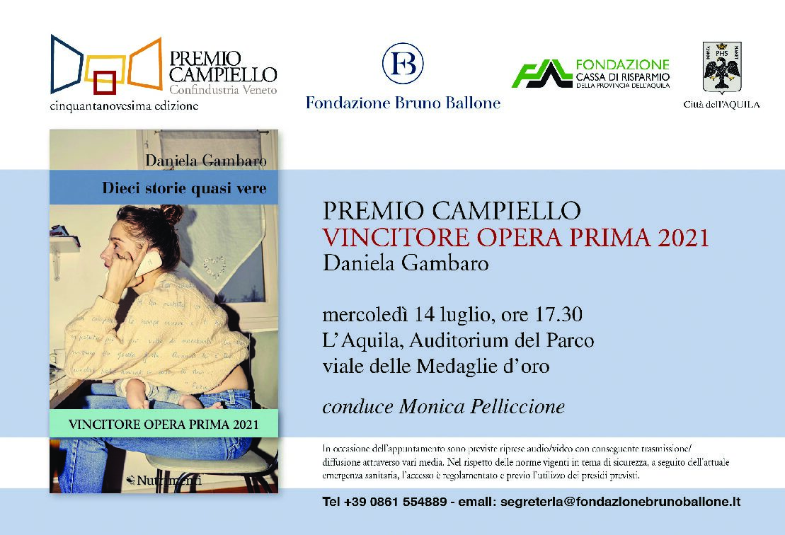 Il Premio Campiello Opera Prima è un riconoscimento istituito nel 2004, che viene assegnato ad un autore esordiente, non prevede limiti di età e viene attribuito e annunciato dalla Giuria dei Letterati nel corso della Cerimonia di Selezione. L’appuntamento dell’Aquila è il primo di un ciclo di incontri aperti al pubblico che il Premio Campiello organizza per presentare il vincitore della sezione Opera Prima al pubblico dei lettori e che proseguirà mercoledì 21 luglio a Jesolo Lido (VE), giovedì 22 luglio a Venezia e venerdì 23 luglio a Castelnuovo del Garda (VR).