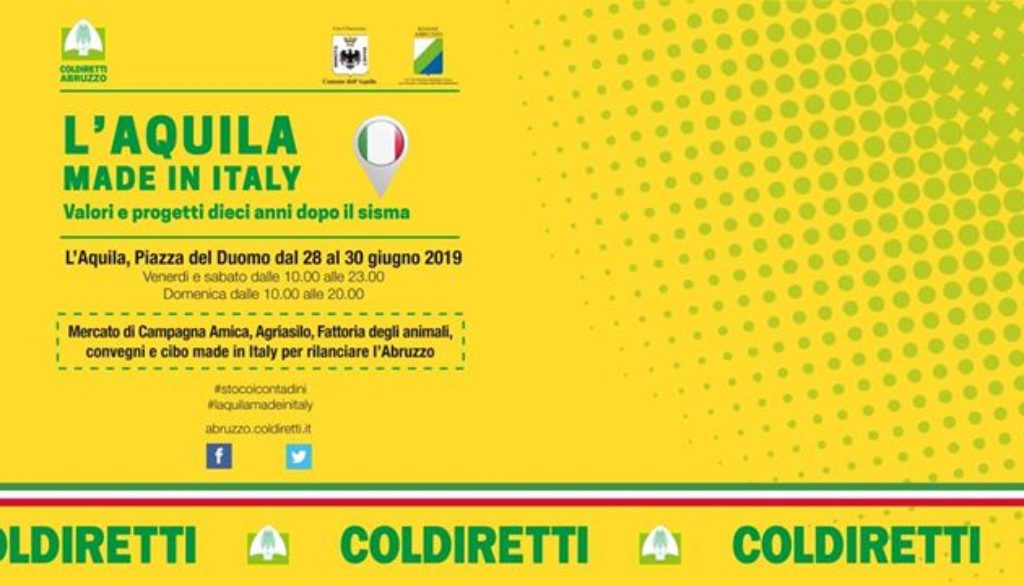 Promosso da Coldiretti Abruzzo, per tre giorni, da venerdì alle ore 10.00 a domenica alle ore 20.00, l’evento animerà la piazza più conosciuta del capoluogo abruzzese per lanciare un messaggio di rinascita e ricostruzione con gli imprenditori agricoli di Coldiretti. Verranno allestiti un mercato di Campagna Amica, anche con le tipicità delle zone colpite dai terremoti del 2009 e del 2016-17, laboratori per bambini e laboratori del gusto, aree per lo street food e uno spazio riservato alla riflessione con una serie di seminari e tavole rotonde in cui verranno trattati i tempi più importanti per il futuro dell’economia non solo aquilana ma abruzzese. Ad aprire la manifestazione l’inno di Mameli cantato dal tenore Alberto Martinelli e dalla soprano Ylenia Scimia: seguirà la cerimonia di inaugurazione con la presenza del sindaco dell’Aquila Pierluigi Biondi, del presidente della Regione Abruzzo Marco Marsilio, del cardinale Giuseppe Petrocchi (arcivescovo metropolita dell’Aquila) e del Presidente nazionale di Coldiretti Ettore Pradini. A seguire, il convegno “Il valore del made in Italy per una ricostruzione di valore” con gli interventi dei presidenti Coldiretti delle regioni terremotate Maria Letizia Gardoni (Marche), Albano Agabiti (Umbria), David Granieri (Lazio) e Silvano Di Primio (Abruzzo), del medico aquilano Romeo Pulsoni e dell’assessore alle politiche agricole della Regione Abruzzo Emanuele Imprudente.