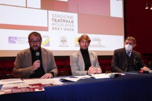 Una stagione di qualità per il ritorno alla capienza massima, pre Covid, quella presentata dal ‘Teatro Stabile d’Abruzzo’. Ad illustrare il cartellone il direttore del TSA Giorgio Pasotti col sindaco Pierluigi Biondi ed il presidente della Regione Marco Marsilio. Dieci spettacoli organizzati in due turni: si inizia il 23 novembre per terminare il 12 maggio. Spiccano le produzioni proprie dello Stabile d’Abruzzo.