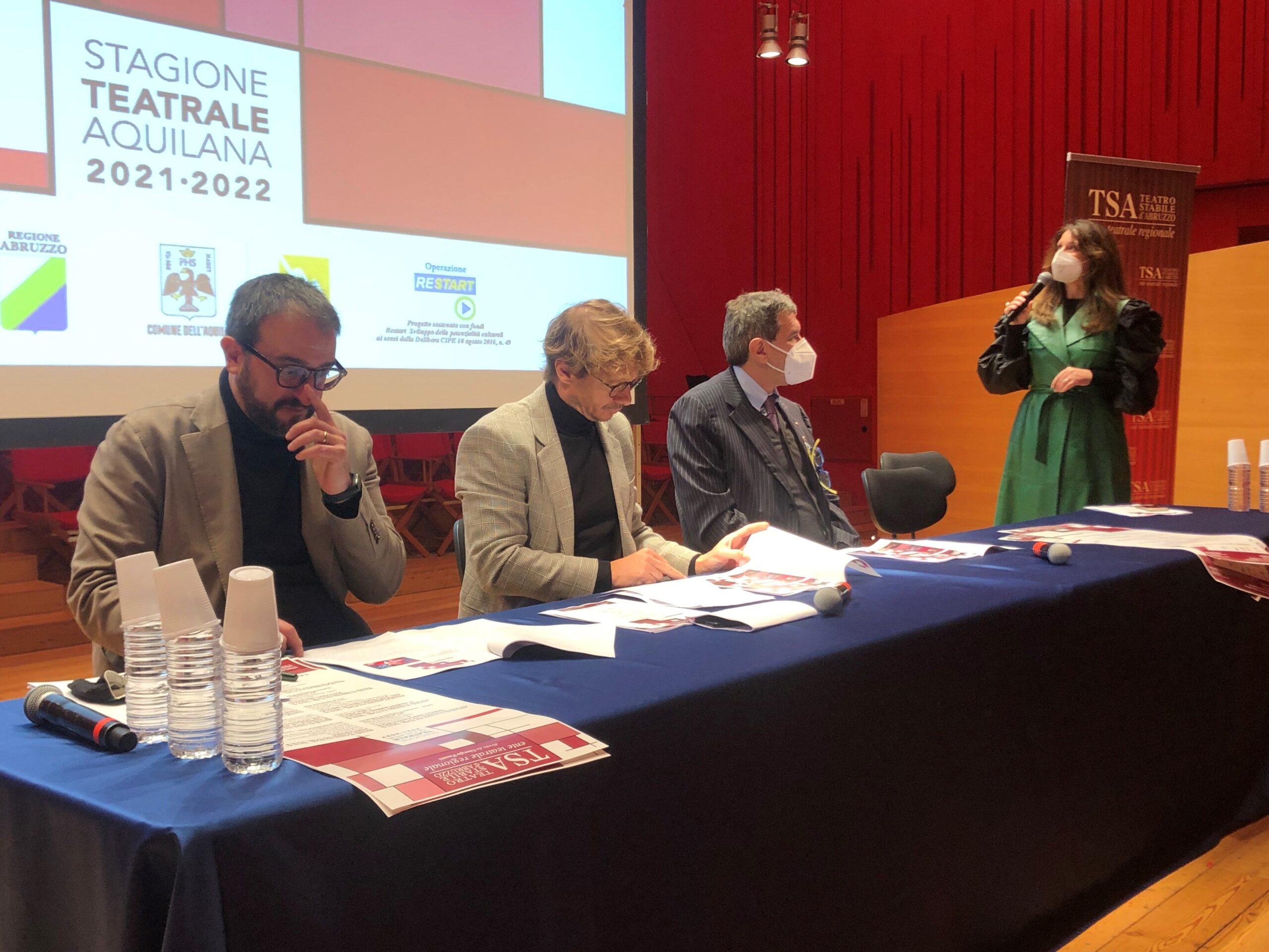Una stagione di qualità per il ritorno alla capienza massima, pre Covid, quella presentata dal ‘Teatro Stabile d’Abruzzo’. Ad illustrare il cartellone il direttore del TSA Giorgio Pasotti col sindaco Pierluigi Biondi ed il presidente della Regione Marco Marsilio. Dieci spettacoli organizzati in due turni: si inizia il 23 novembre per terminare il 12 maggio. Spiccano le produzioni proprie dello Stabile d’Abruzzo.