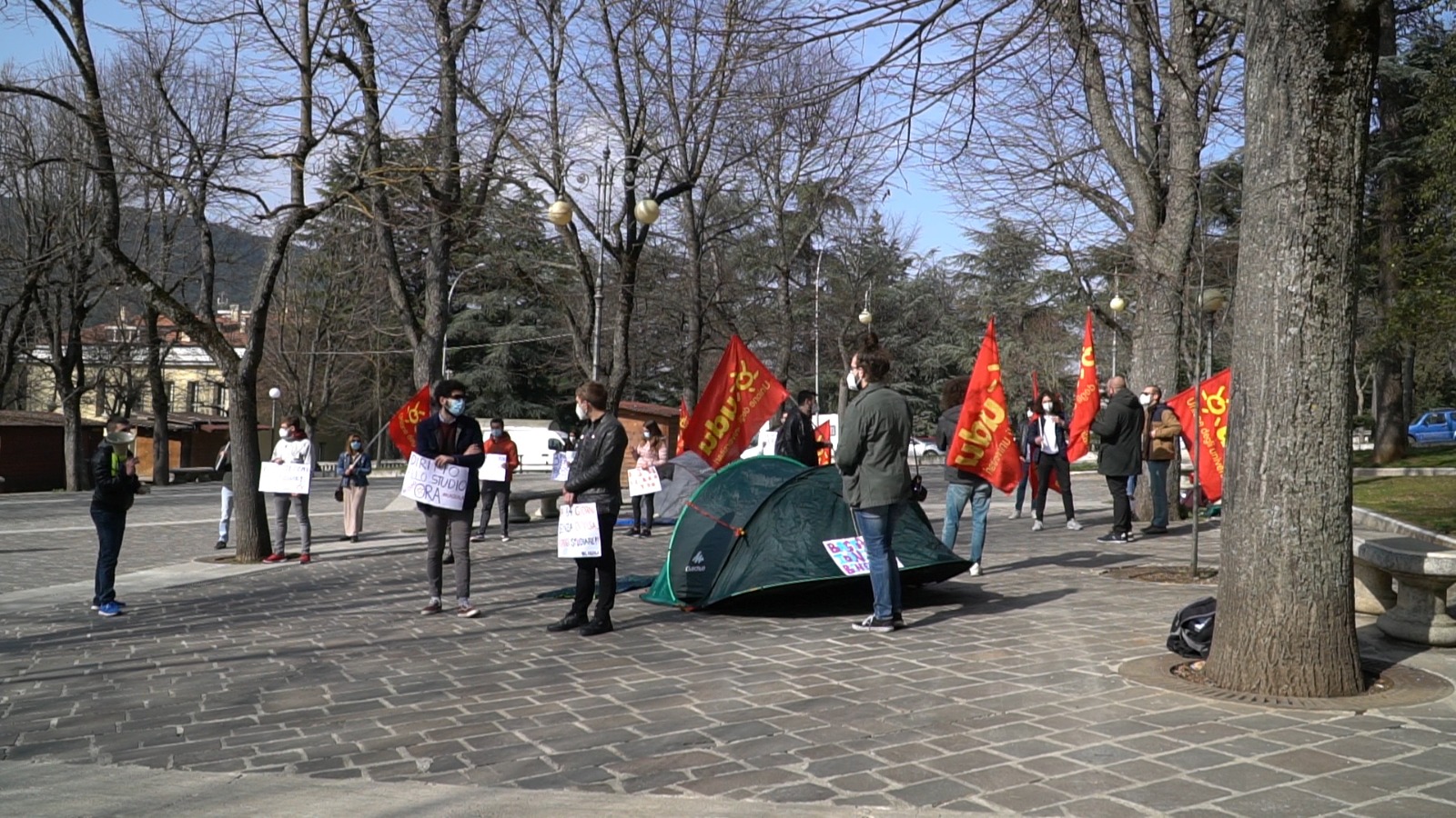 Studenti universitari in piazza oggi all’Aquila, davanti all’Emiciclo, per protestare contro la mancata erogazione di borse di studio attese da dicembre.