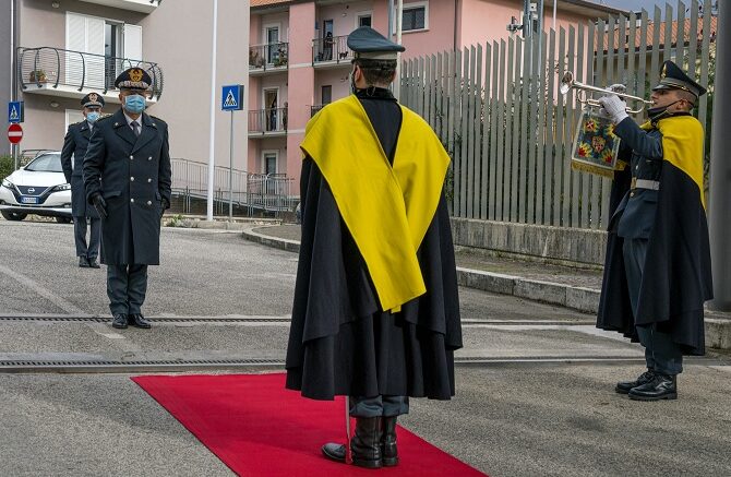 Durante la visita, si è svolta una cerimonia di intitolazione della “Piazza d’Armi” della Caserma “M.A.V.M. Tito Giorgi” al Maresciallo Mario Tirino, in forza al Comando Regionale Abruzzo, venuto a mancare per complicanze legate al COVID-19.
